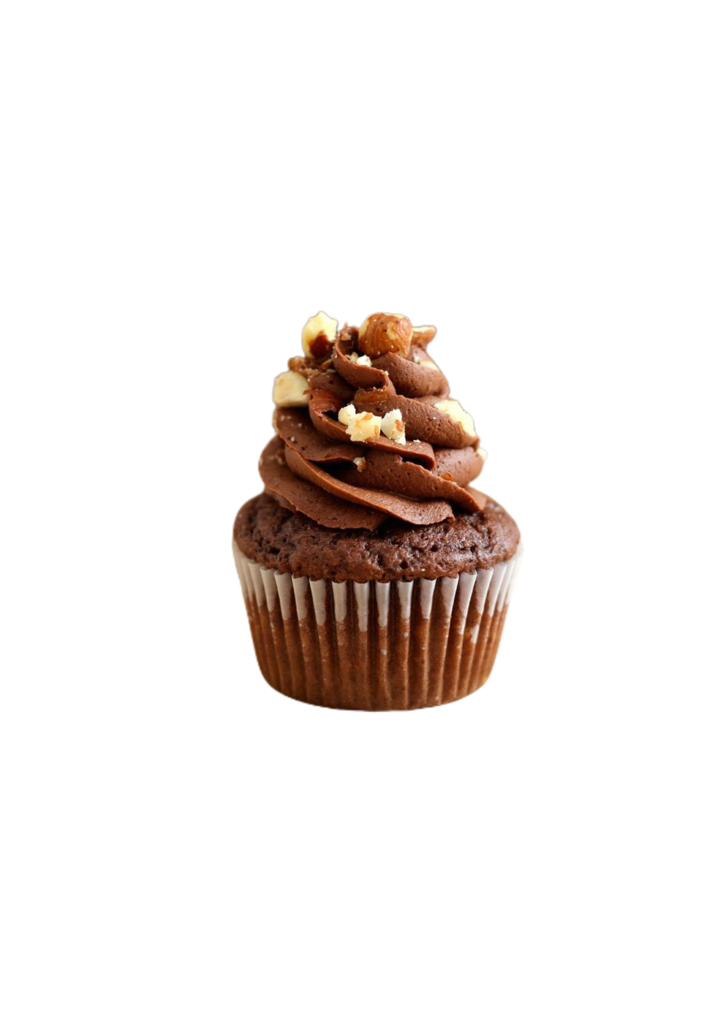 Chocolate cupcake topped with chocolate ganche and caramelized hazelnuts